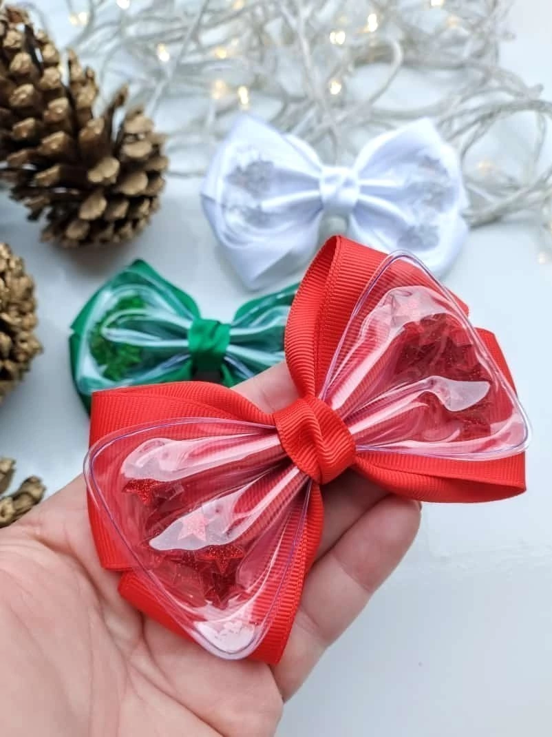 Laço com aproximadamente 11cm, detalhe em plástico com estrelinhas dentro.